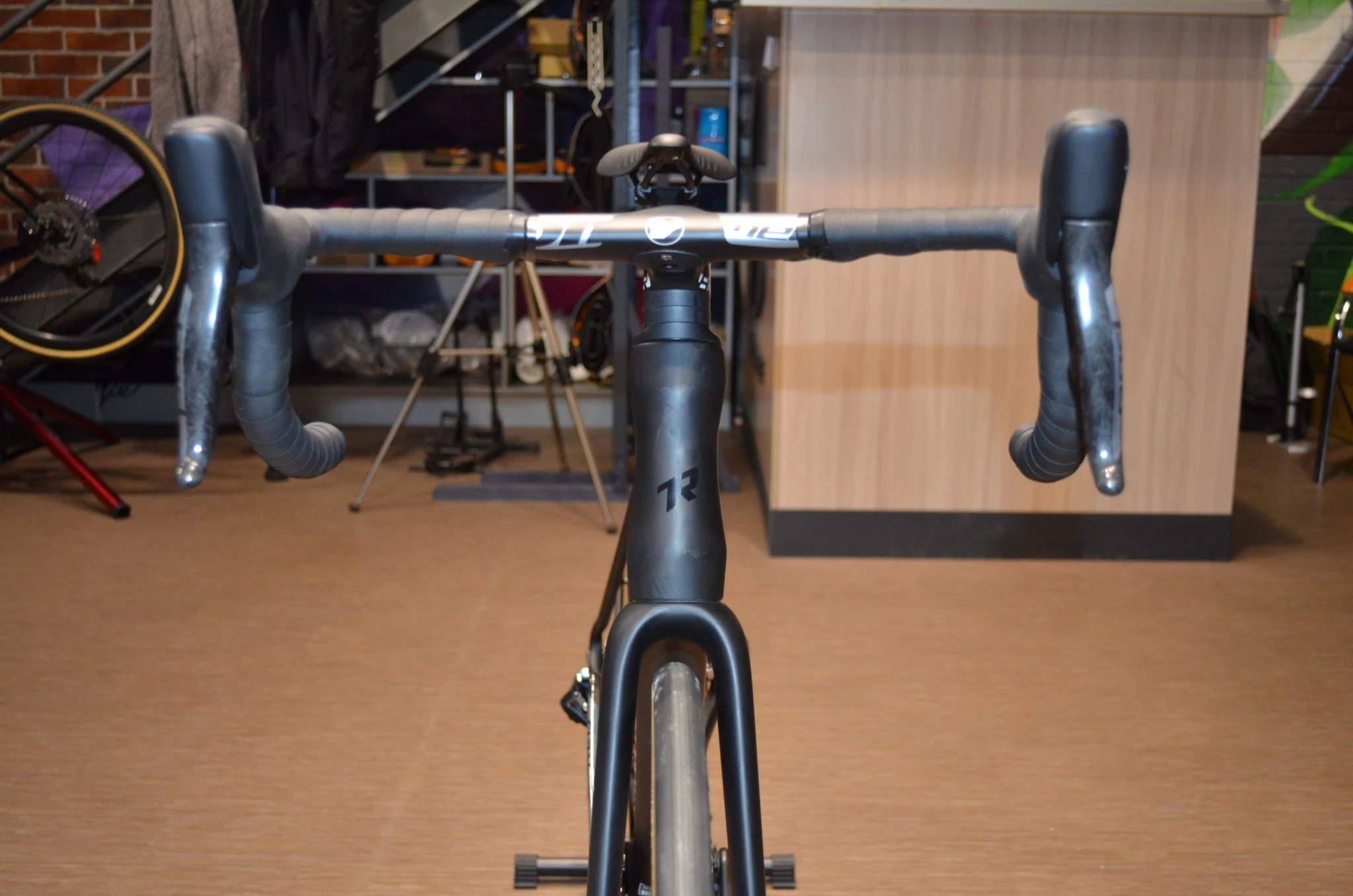 Кокпит, избавленный от проводки, как в целом велосипед. Но бросается в глаза именно рулевая колонка FSA Vision ACR. Внутри руля гидролинии и рубашка – вся проводка пролегает через вынос и вдоль штока спускается к нижней трубе. Открытые части троса только в области ноги вилки и левого нижнего пера заднего треугольника, заднего переключателя. При этом незаметны.